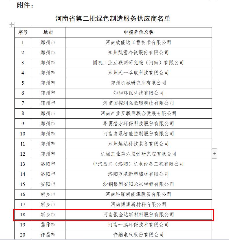 近日,河南省工信廳公示河南省第二批綠色制造服務(wù)供應(yīng)商名單,河南銀金達(dá)新材料股份有限公司在列。