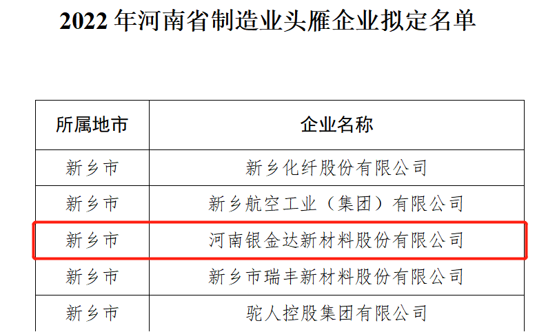 近日,省工信廳公示了2022年河南省制造業頭雁企業擬認定名單,河南銀金達新材料股份有限公司順利入選。